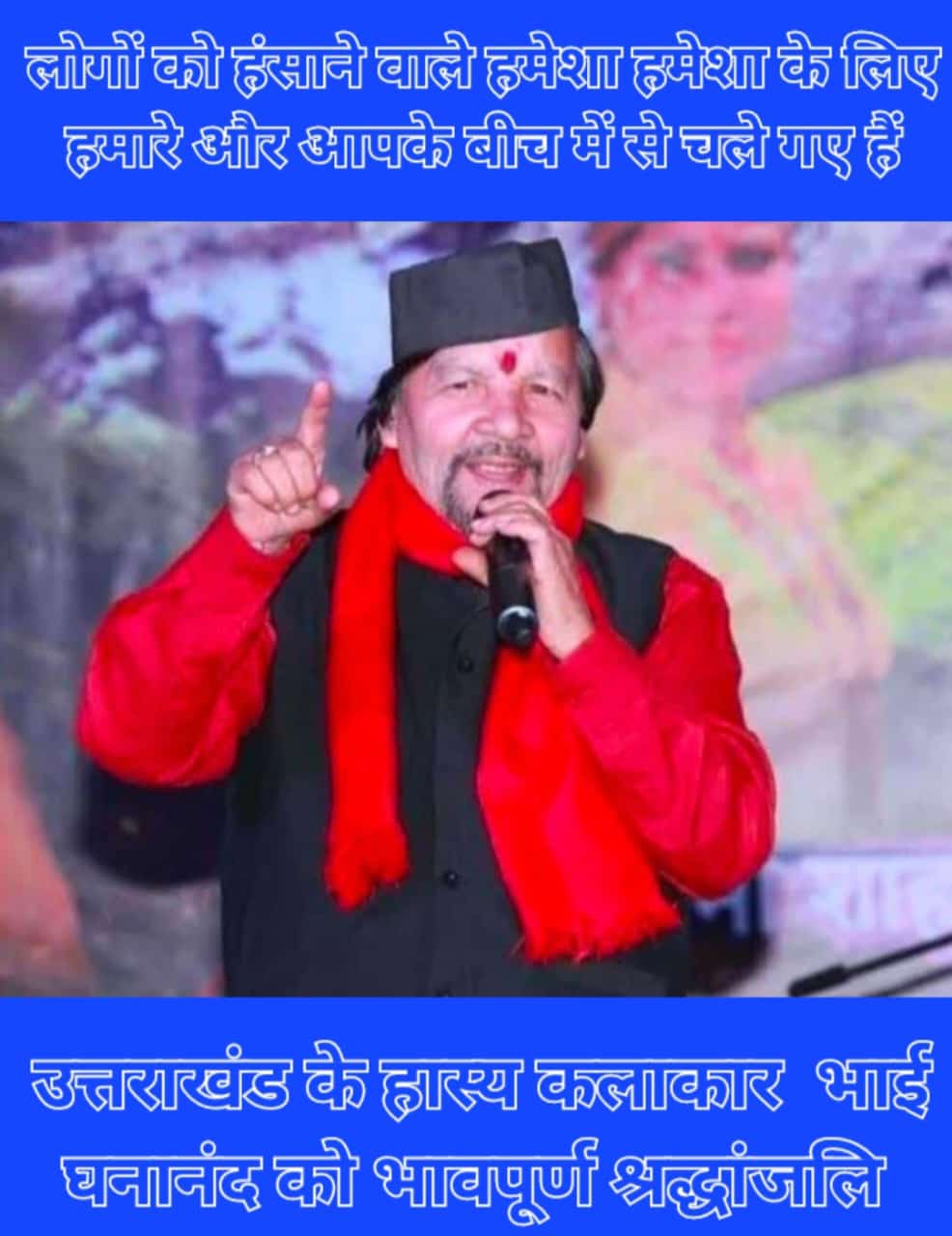 देहरादून। उत्तराखंड के प्रसिद्ध प्रसिद्ध हास्य कलाकार घन्ना भाई का आज देहरादून के एक निजी अस्पताल में निधन हो गया है। वह कुछ समय से बीमार थे। घनानंद का जन्म 1953 में पौड़ी के कल्जीखाल ब्लॉक के गगोड़ गांव में हुआ था। उनकी शिक्षा कैंट बोर्ड लैंसडौन से हुई थी। घन्ना भाई ने हास्य कलाकार के रूप में अपने सफर की शुरुआत 1970 में रामलीला से किया था।