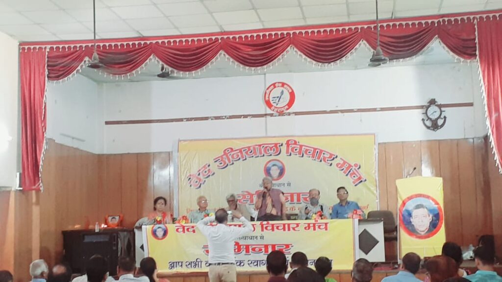 वेद उनियाल विचार मंच ने उत्तराखंड के नव निर्माण की संभावनाओं को लेकर सेमिनार किया। सेमिनार की अध्यक्षता सुशीला बलूनी द्वारा किया गया, मुख्य अतिथि डॉ डी0 एन0 भटकोटी, व विशिष्ट अतिथियों मे वरिष्ठ पत्रकार जय सिंह रावत, धाद के संस्थापक लोकेश नवानी, जगदीश कुकरेती थे| इस अवसर पर मंच के द्वारा चिकित्सा क्षेत्र मे डॉ महेश कुड़ियाल, सामाजिक क्षेत्र मे उत्कृष्ट कार्यों के लिए सामाजिक कार्यकर्ता विजय जुयाल, पर्यावरण संरक्षण के लिए मेती आंदोलन के जनक पदम कल्याण सिंह रावत व साहित्य के क्षेत्र मे डॉ अतुल शर्मा को मानपत्र व शाल उढाकार सम्मानित किया, कार्यक्रम का संचालन सुनील ध्यानी ने किया, इस अवसर पर कार्यक्रम कि अध्यक्षा कर रही सुशीला बलूनी ने कहाँ कि राज्य का स्वप्ना जो देखा था इन 21 वर्षों मे वह स्वप्निने धरे के धरे रह गए, वेद उनियाल को याद करते हुए उन्होंने कहाँ कि वह जूनूनी शख्शियत के धनी थे, विलक्षण ज्ञान, एक रणनितिकार थे। मुख्य अतिथि डॉ डी0 एन0 भटकटी जी ने कहाँ कि एवं एक नयी वैचारिक लड़ाई को धार देनी पडेगी, नौजवानों को तैयार करना होगा। वेद जैसे लोगों को तैयार करना होगा, उन्होंने कहाँ कि विचार और वैचारिकता की ओर मजबूती के साथ आगे बढ़ाना होगा, श्री लोकेश नवानी जी ने कहाँ कि इस समय राजनितिक प्रबंधन के लिए युवाओं व महिलाओं को वैचारिक रूप से मजबूत करना होगा। राज्य मे युवाओं को मानसिक रूप से सकारात्मक सोच को बढ़ाना होगा। राज्य के विकास के लिए क्षेत्रीयता राजनितिक प्रबंधन योजना कि शख्त जरुरत हैं। वेद उनियाल की सोच व विचार को आगे लाना होगाा। सम्मलेन मे जगदीश कुकरेती ने वेद उनियाल के संघर्षो एवं योगदान को बताया। अन्य वक्ताओं मे इंदु नौडियाल, उर्मिला शर्मा, ओमी उनियाल, बबिता अनंत आकाश डी के पाल, जगमोहन नेगी, जब्बर सिंह पावेल, जगदीश चौहान, सतीश धौलाखंडी, मीनाक्षी घिल्डियाल ने विचार रखे, इस अवसर पर स्व0 वेद उनियाल जी की पत्नी महेन्द्र कौर उनियाल को मंच के द्वारा अभिवादन किया गया। इस अवसर पर मुकेश पाठक, विपिन रावत, अनिल डोभाल, राजेंद्र गुसांईं, विजय प्रताप मल्ल, सुशील चमोली, मोहन रावत, प्रदीप कुकरेती, एन के गुसांईं, आशीष उनियाल, गणेश डंगवाल, संजय डोभाल, दिनेश सक्सेना, सचिन भट्ट, सुलोचना ईष्टवाल, मीनू थपलियाल, बीना नेगी, उत्तम रावत आदि उपस्थित रहे|